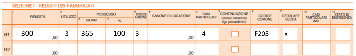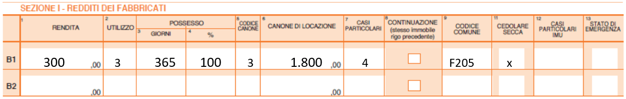 - compilare un unico rigo, riportando in colonna 6 la quota di canone effettivamente percepita (nell’esempio euro 600 x 3 mensilità);