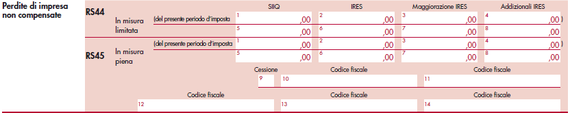 - il cessionario indica nel rigo RS45 le perdite trasferite eccedenti quelle già computate in diminuzione del reddito complessivo dello stesso periodo d’imposta nel quadro RN o in altri quadri di determinazione del base imponibile.