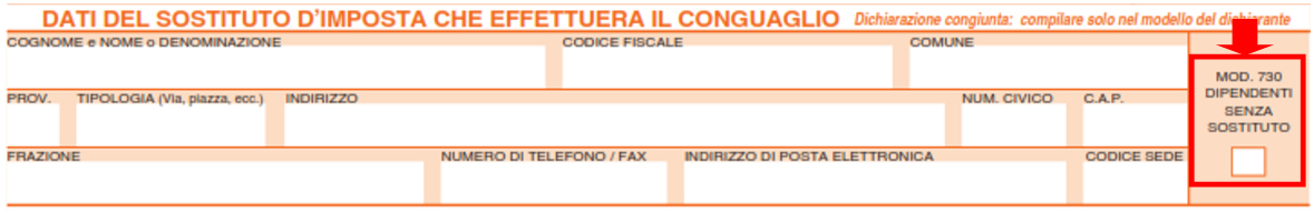 - nel riquadro “dati del sostituto d’imposta che effettuerà il conguaglio” dovrà essere barrata la casella “ 730 dipendenti senza sostituto”