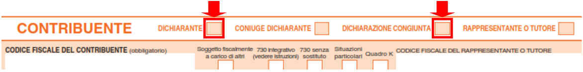 Nel modello del dichiarante dovranno essere barrate le caselle “dichiarante” e “dichiarazione congiunta” nel riquadro delle informazioni relative al contribuente e dovrà essere compilata la sezione “Dati del sostituto d’imposta che effettuerà il conguaglio”.