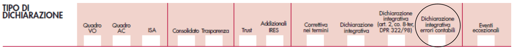 Nel frontespizio è stata prevista la nuova casella “Dichiarazione integrativa errori contabili” per segnalare la presentazione di una dichiarazione integrativa a favore per la correzione di errori contabili di competenza, oltre il termine prescritto per la presentazione della dichiarazione relativa al periodo d’imposta successivo.