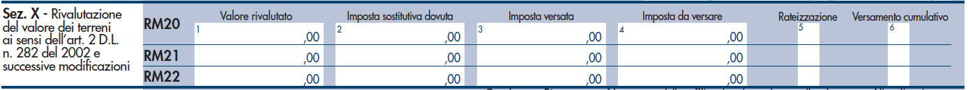 Nei righi da RM20 a RM22 devono essere distintamente indicate, per il periodo d’imposta 2020, le operazioni relative alla rideterminazione del valore dei terreni edificabili, dei terreni agricoli e dei terreni oggetto di lottizzazione.
