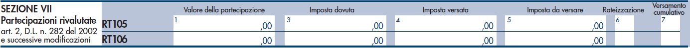 Analogamente, nei righi RT105 e RT106 devono essere indicate le informazioni relative alla rideterminazione del valore delle partecipazioni, quote o diritti non negoziate nei mercati regolamentati.