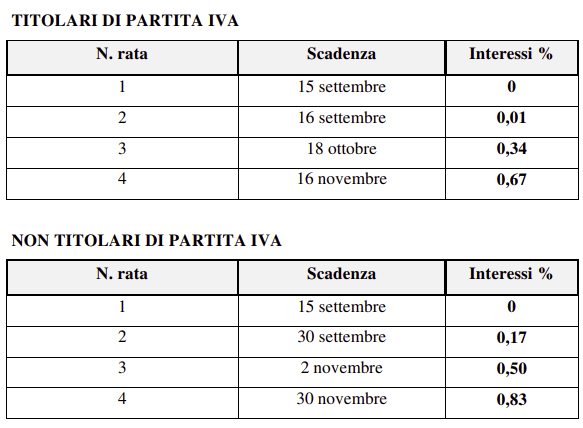 - in un massimo di quattro rate, con scadenza della prima il 15 settembre e con applicazione degli interessi a partire dalla rata successiva alla prima.