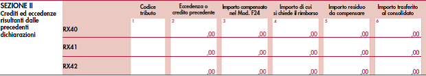 La sezione II del quadro RX è deputata ad accogliere le eccedenze ed i crediti relativi al periodo d’imposta precedente che non possono confluire nel quadro corrispondente a quello di provenienza, al fine di consentirne l’utilizzo con l’indicazione degli stessi nella presente dichiarazione.