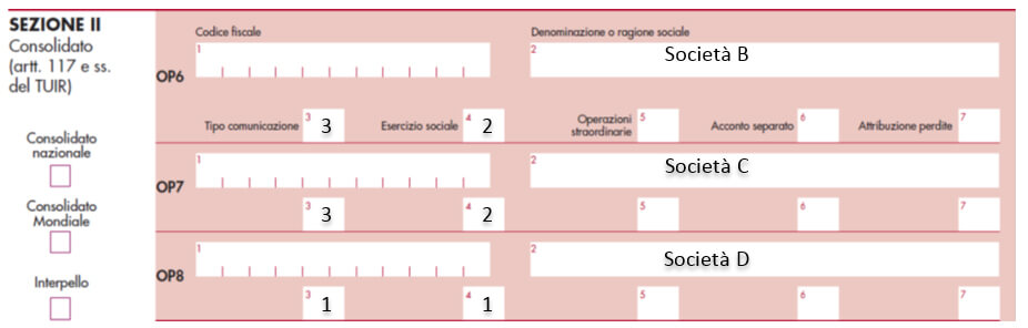 Se ad esempio in seguito all’iniziale comunicazione di esercizio dell’opzione (nel 2015) da parte delle società A (consolidante), B e C (consolidate), si verifichi, nel 2016, l’esercizio dell’opzione per la nuova società D, il quadro dovrà essere così compilato: