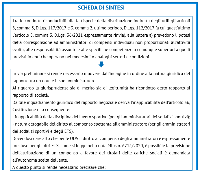 Ciò premesso tra le condotte riconducibili alla fattispecie della distribuzione indiretta degli utili gli articoli 8, comma 3, D.Lgs. 117/2017 e 3, comma 2, ultimo periodo, D.Lgs. 112/2017 (a cui quest’ultimo l’articolo 8, comma 3, D.Lgs. 36/2021 espressamente rinvia), prevedono alla lettera a) l’ipotesi della corresponsione ad amministratori: