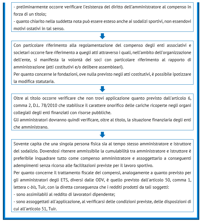 Dovendosi ipotizzare che tale chiarimento possa operare anche nei confronti di enti diversi dalle società (ad esempio le associazioni) è possibile affermare che il compenso percepito dagli amministratori dei sodalizi sportivi, e anche degli ETS, è assimilabile a quello dei lavoratori dipendenti.