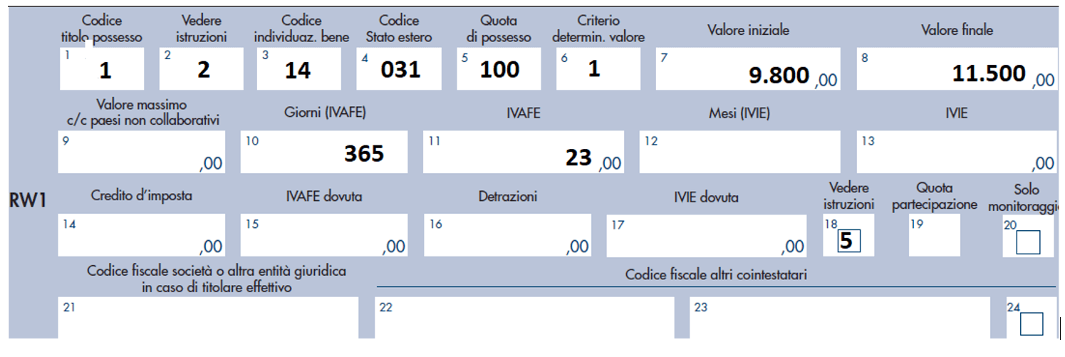 Diversamente, ad esempio con l’indicazione del codice 2 nella casella 18, si segnala la compilazione del quadro RM per l’assoggettamento ad imposta sostitutiva dei redditi prodotti in collegamento all’investimento finanziario all’estero.