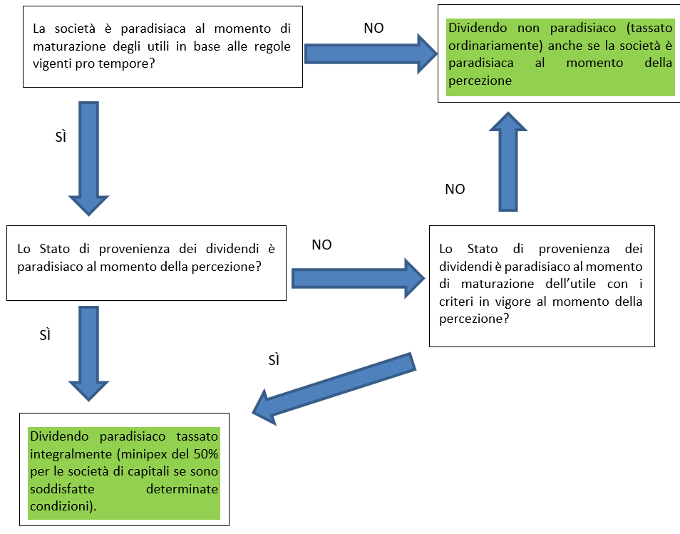 Un primo esame prevede l’analisi dell’anno di percezione dell’utile. Se la società risulta essere paradisiaca in tale momento, ovviamente in base alle regole vigenti pro tempore ossia al momento della percezione, il dividendo risulta essere paradisiaco e l’analisi si esaurisce.