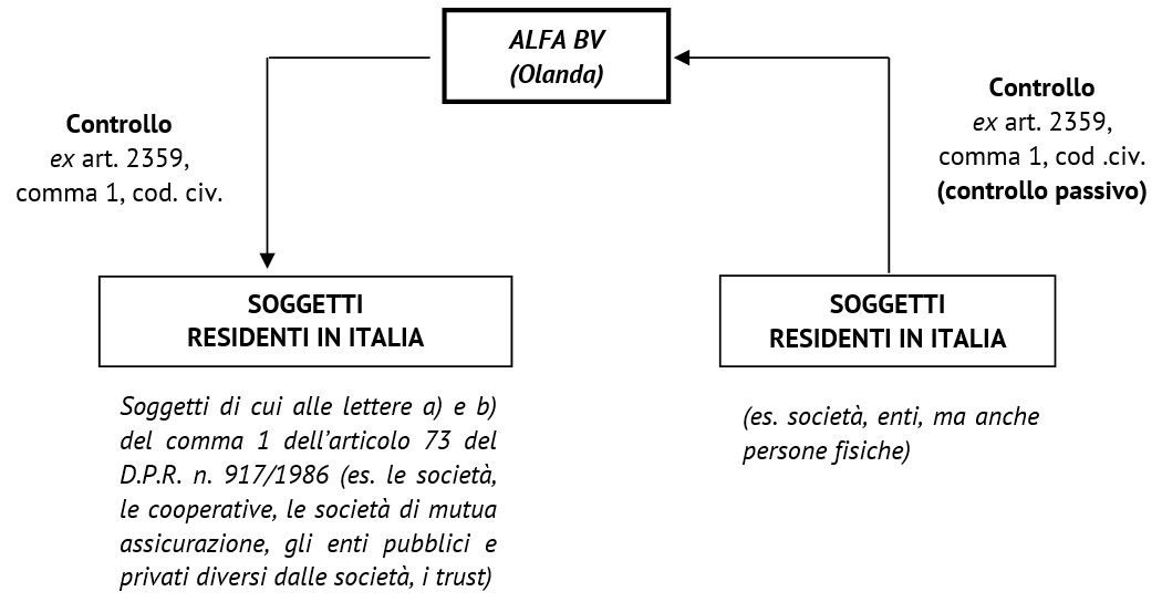 - sono controllati, anche indirettamente, ai sensi dell’articolo 2359, primo comma, del codice civile, da soggetti residenti nel territorio dello Stato (“cosiddetto controllo passivo”);