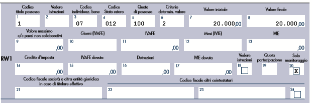 Le colonne 2, 19 e 21 non vanno compilate in quanto relative alla questione del titolare effettivo e quindi riferite solo a partecipazioni societarie e trust.