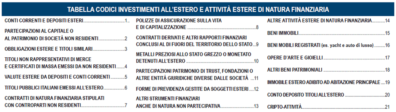 Un ulteriore interessante novità riguarda la tabella dei codici investimenti detenuti all’estero presente nell’appendice del Fascicolo 2 e che per opportunità proponiamo di seguito.