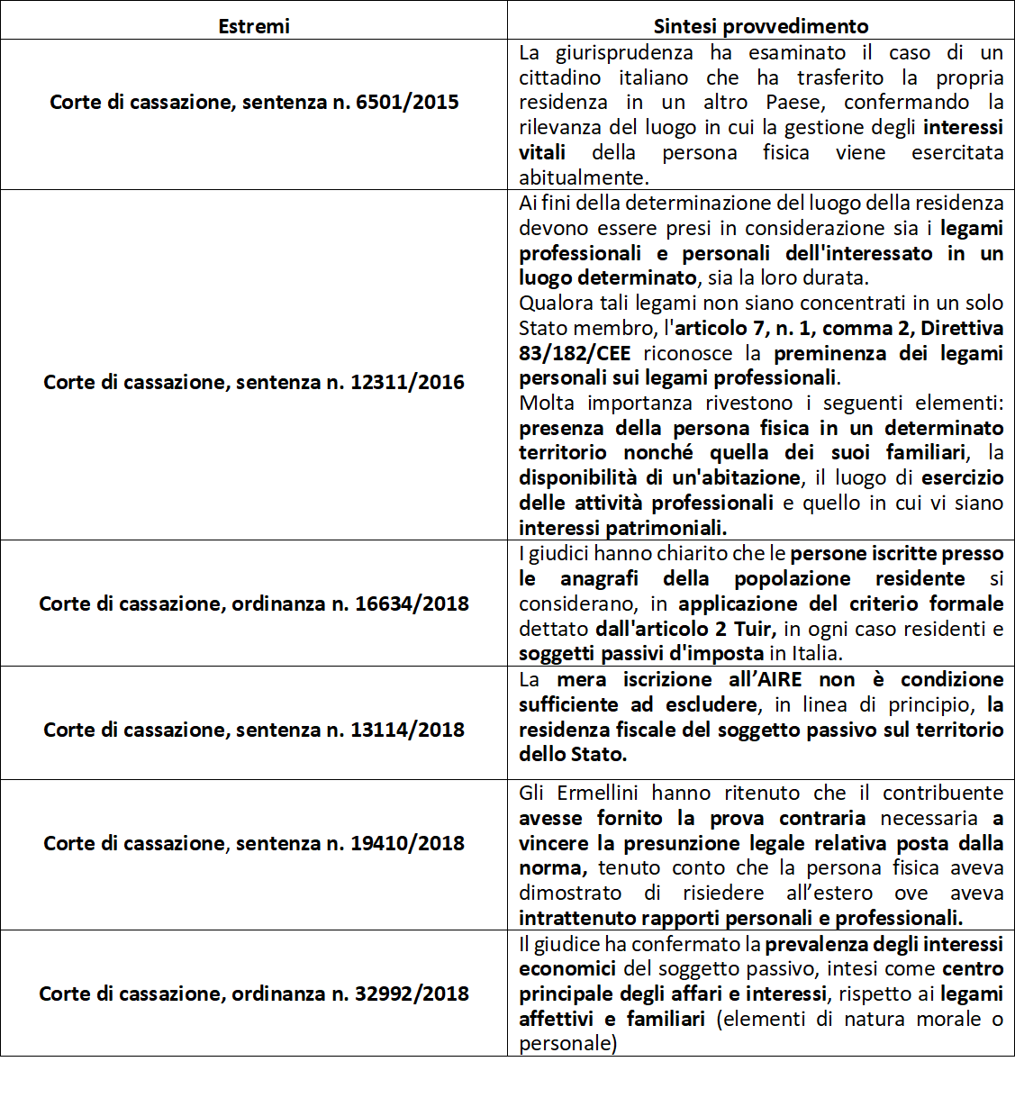 Tali elementi sono rinvenibili, a titolo esemplificativo, nelle recenti sentenze emesse dalla Corte di cassazione in tema di residenza fiscale della persona fisica, di seguito evidenziate.