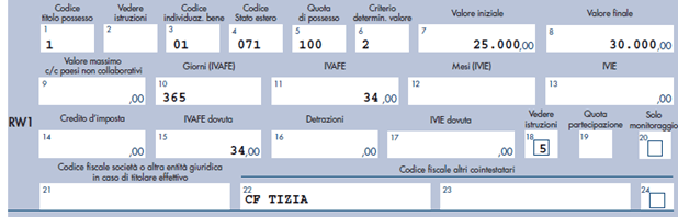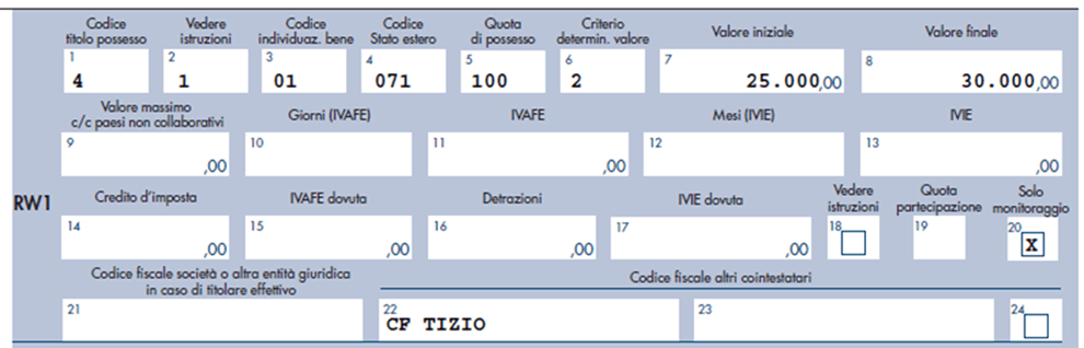 Per fare un esempio pratico, infatti, se Tizio e Tizia sono marito e moglie, entrambi fiscalmente residenti in Italia e Tizio ha un conto corrente in Svizzera in cui Tizia è delegata alla movimentazione e/o al prelievo, entrambi i contribuenti dovranno compilare il quadro RW come di seguito: