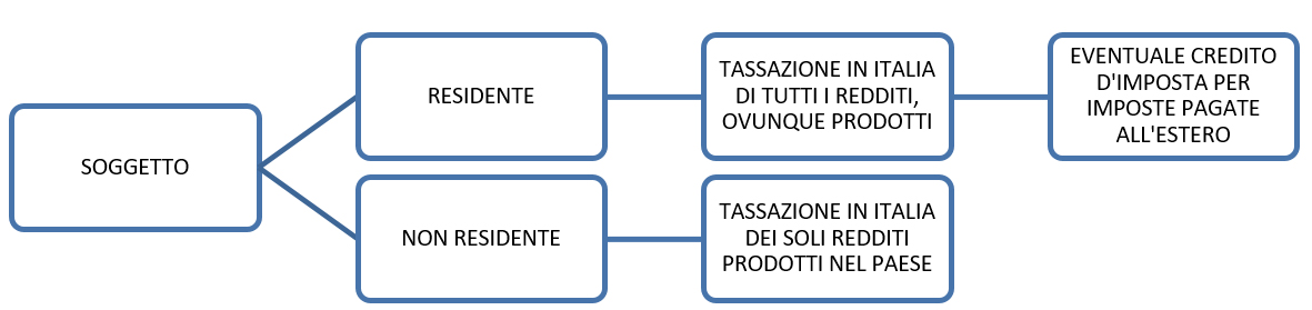 Nei confronti dei soggetti fiscalmente residenti nel territorio dello Stato vale il principio della cosiddetta tassazione mondiale (world wide taxation): devono in altre parole dichiarare in Italia tutti i redditi prodotti, anche quelli generati all’estero, beneficiando per questi ultimi, se ne ricorrano le condizioni, di un credito d’imposta.