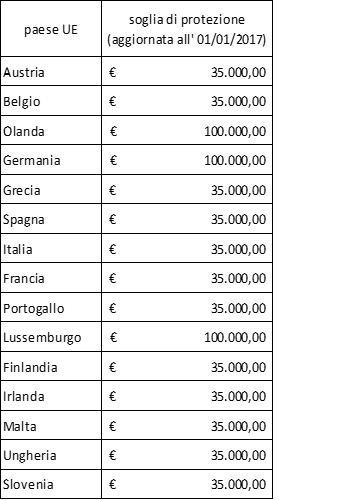 Le “soglie di protezione” dei principali Paesi europei (che possono essere pari ad € 100.000,00 o ad un minor importo stabilito da ciascuno Stato membro) sono le seguenti: