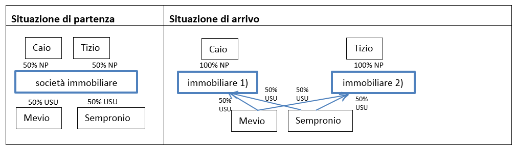 Gli usufruttuari, invece, sono altri due soggetti, Mevio e Sempronio, entrambi usufruttuari al 50% ciascuno. L’aspetto interessante dell’operazione in questione è che Mevio e Sempronio conservano il loro diritto di usufrutto anche a seguito della scissione, ma ognuno con il 50% in entrambe le società. Per questi due soggetti potremo dire che la scissione si presenta come “proporzionale”.