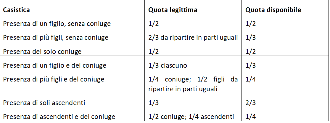 A coniuge e figli e, in mancanza di figli e loro discendenti, agli ascendenti, l’ordinamento riserva infatti inderogabilmente una quota del patrimonio del congiunto deceduto, variabile a seconda della “qualità” e “quantità” di legittimari presenti al momento dell’apertura della successione: