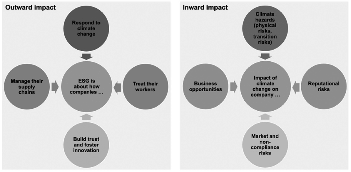 Anzitutto, la nuova prospettiva di rendicontazione proposta dalla CSRD offre la possibilità alle imprese di svolgere una più approfondita analisi non solo riguardante i suoi impatti verso l’esterno, ma, soprattutto, circa i risvolti, potenziali o attuali, in termini di rischi e opportunità che l’evoluzione del contesto esterno può avere sulla propria organizzazione (si tratta del principio di doppia materialità, già introdotto nella sezione 2 di questo contributo). Ciò consente un maggior livello di consapevolezza e di capacità di previsione e gestione dei rischi futuri. La seguente figura, incentrata sull’analisi di doppia materialità riguardante le tematiche di cambiamento climatico (ma estendibile anche agli altri ambiti ESG), fornisce in sintesi la prospettiva da assumere nell’affrontare le tematiche ESG a livello aziendale: