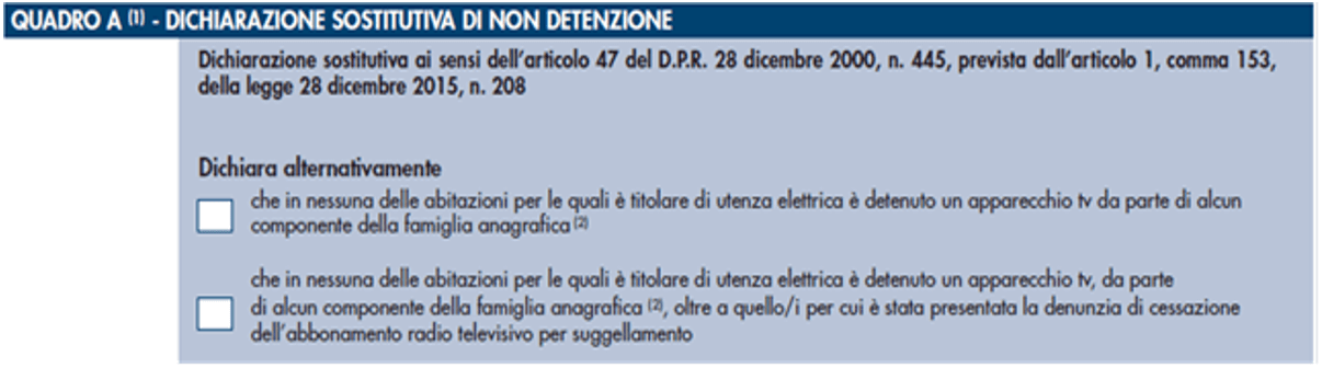 - in nessuna delle residenze per le quali il dichiarante è titolare di utenza elettrica, è presente un apparecchio televisivo appartenente alla stessa famiglia anagrafica (riferito al quadro A del modello);
