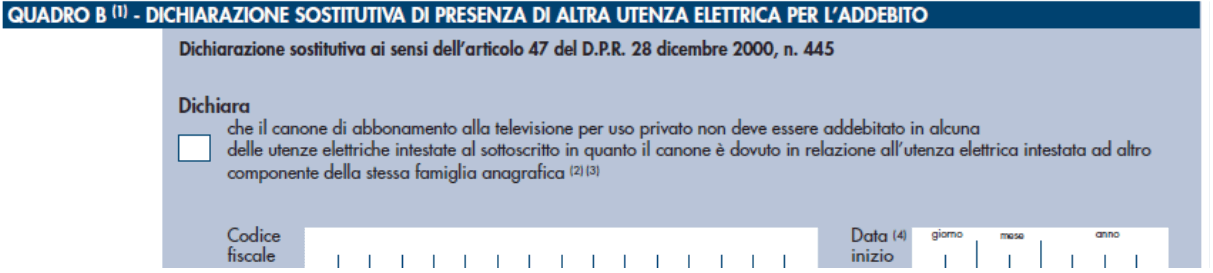 - il canone televisivo non deve essere addebitato su nessuna delle utenze elettriche intestate al dichiarante, poiché è dovuto in relazione all’utenza elettrica intestata a un altro membro della stessa famiglia (riferito al quadro B del modello).