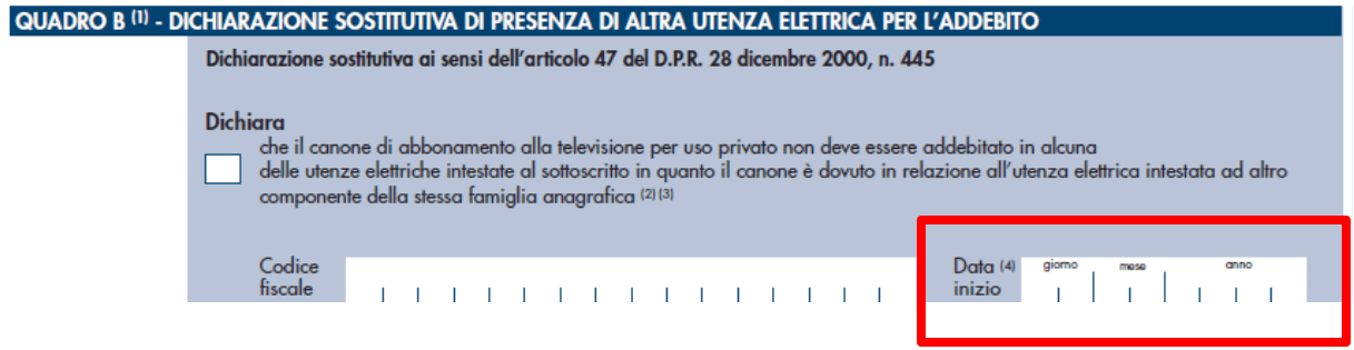 La dichiarazione sostitutiva riguardante la presenza di un’altra utenza elettrica per l’addebito del canone (quadro B del modello) può essere depositata in qualsiasi periodo dell’anno. La sua efficacia, ai fini del calcolo del canone dovuto, si basa sulla data di inizio dei presupposti attestati, indicata nel campo “data inizio”.