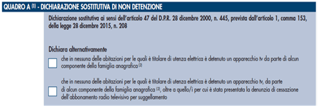 - in nessuna delle residenze per le quali il dichiarante è titolare di utenza elettrica, è presente un apparecchio televisivo appartenente alla stessa famiglia anagrafica (riferito al quadro A del modello);