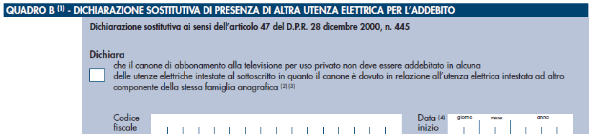 - il canone televisivo non deve essere addebitato su nessuna delle utenze elettriche intestate al dichiarante, poiché è dovuto in relazione all’utenza elettrica intestata a un altro membro della stessa famiglia (riferito al quadro B del modello).