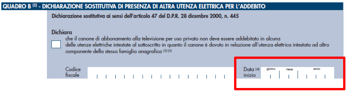 La dichiarazione sostitutiva riguardante la presenza di un’altra utenza elettrica per l’addebito del canone (quadro B del modello) può essere depositata in qualsiasi periodo dell’anno. La sua efficacia, ai fini del calcolo del canone dovuto, si basa sulla data di inizio dei presupposti attestati, indicata nel campo “data inizio”.