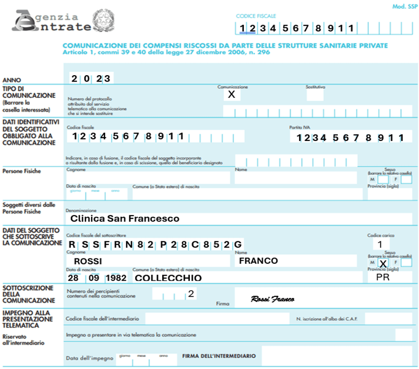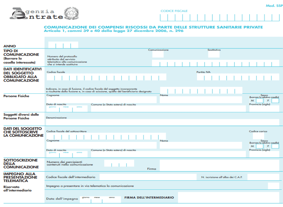 - comunicare in via telematica all’Agenzia delle entrate l’ammontare complessivo dei compensi riscossi per ciascun professionista, utilizzando l’apposito modello “SSP” da trasmettere entro il 30 Aprile di ciascun anno con riferimento ai compensi corrisposti nell’anno precedente.