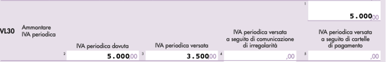 In particolare, all’interno del rigo VL30, denominato “Ammontare IVA periodica”, in campo 3, deve essere indicato il totale dei versamenti periodici effettivamente effettuati da parte del contribuente.
