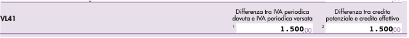 - nel rigo VL41, campo 1, occorre indicare la differenza, se positiva, tra Iva periodica dovuta e Iva periodica versata, ossia 1.500 euro;