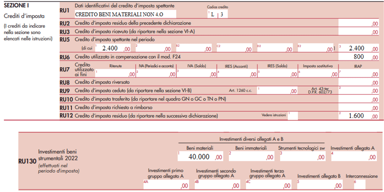 - nella colonna 2, l’importo del credito d’imposta maturato per investimenti effettuati successivamente alla chiusura del periodo d’imposta oggetto della dichiarazione ed entro il 30 novembre 2023 (30 giugno 2023 per i beni immateriali 4.0), per i quali entro il 31 dicembre 2022 si sia proceduto all’ordine vincolante e sia stato versato l’acconto del 20 per cento del prezzo di acquisto (tale importo, qualora utilizzato in compensazione, non può essere riportato nel rigo RU6 della presente dichiarazione in quanto compensato nel periodo d’imposta successivo a quello oggetto della dichiarazione).