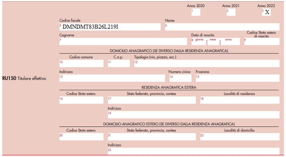 A tal fine riprendendo il nostro esempio è necessario compilare il rigo RU150 indicando, negli appositi campi, per ogni titolare effettivo persona fisica: