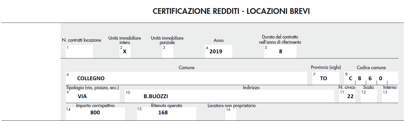 Nel punto 5, il sostituto d’imposta deve indicare il numero dei giorni della durata del contratto di locazione ricompresa nel periodo di riferimento. I dati relativi all’indirizzo dell’immobile, invece, devono essere esposti nei punti da 6 a 13.