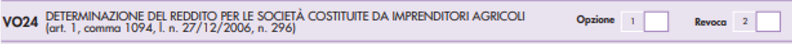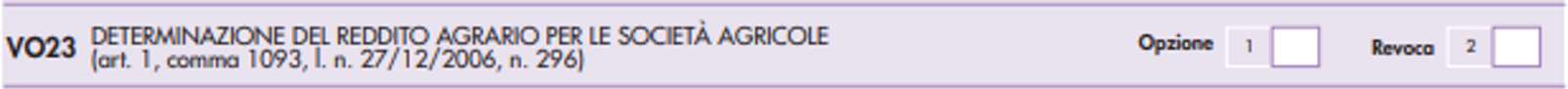 Particolare rilevanza ha, alla luce anche delle novità introdotte con il D.Lgs. 192/2024, di recepimento della delega di cui alla L. 111/2023, la possibilità, da manifestare nel rigo VO23, di poter, da parte delle società agricole di cui all’articolo 2, D.Lgs. 99/2004, con esclusione delle Spa e delle Sapa, optare per la determinazione del reddito, che rimane di impresa, secondo le regole previste dall’articolo 32, Tuir, e quindi, su base catastale.