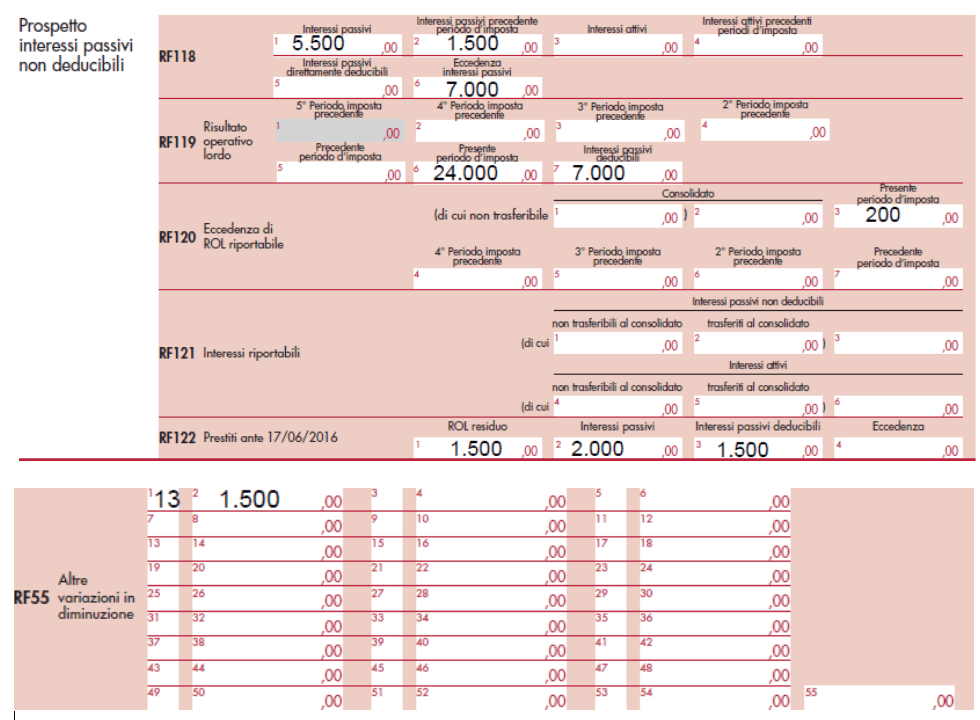 - del rigo RF55, in cui va indicata con il codice 13 la variazione in diminuzione conseguente all’applicazione della disciplina degli interessi passivi;