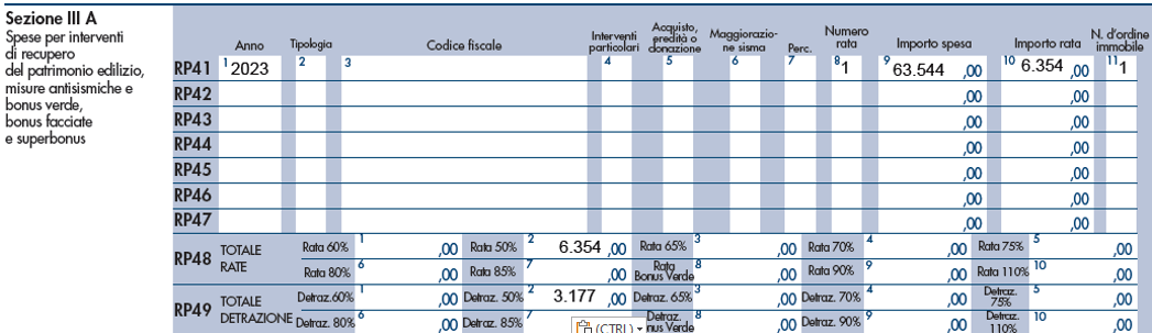 Con riferimento al periodo d’imposta 2023, l’agevolazione spetta in misura pari al 50% del costo di costruzione documentato dall’impresa costruttrice, nel limite di 96.000 euro. Pertanto, ipotizzando un costo di realizzazione del box di 63.544 euro, nonché che il pagamento del corrispettivo sia avvenuto nel 2023, la sezione III-A Spese per interventi di recupero del patrimonio edilizio, misure antisismiche e bonus verde, bonus facciate e superbonus del quadro RP del modello Redditi PF 2024 va così compilata.