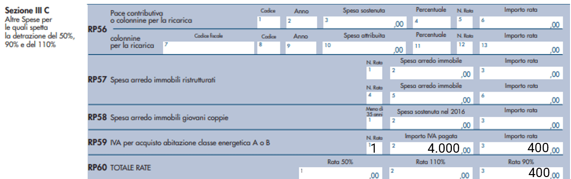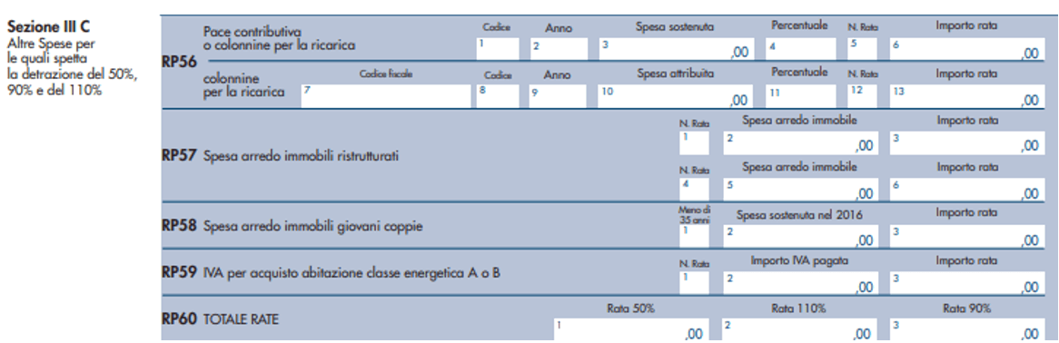 A rigo RP60 (Totale rate) occorre riportare, invece, la somma degli importi indicati nelle colonne 3 e 6 dei righi RP57, nella colonna 4 del rigo RP58, e nella colonna 3 del rigo RP59 di tutti i moduli compilati. Su questo importo si determina la detrazione del 50 % che va riportata nel rigo RN15.