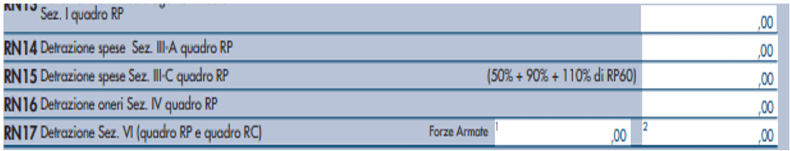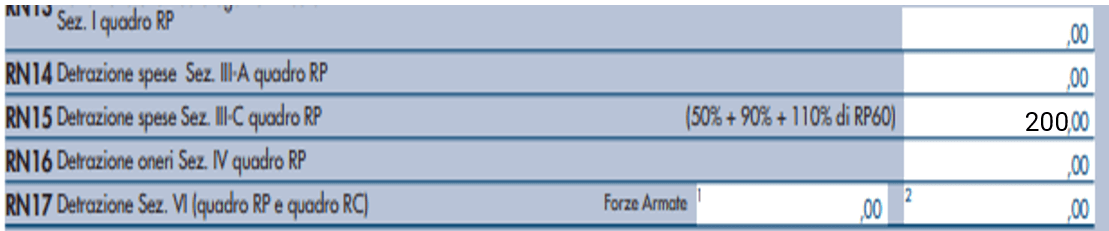 Sull’importo indicato a rigo RP 60 si determina la detrazione del 50 % che andrà poi riportata nel rigo RN15.