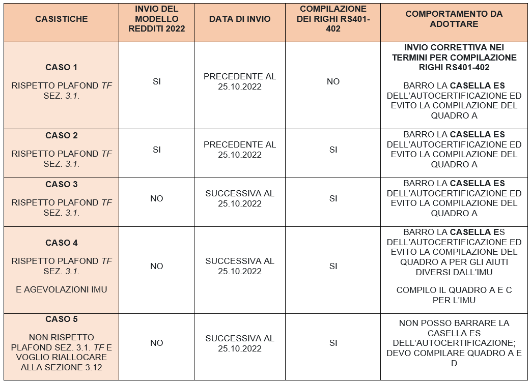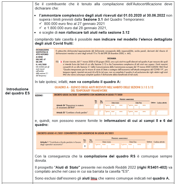 Si fa presente che la compilazione semplificata è facoltativa, quindi il dichiarante può comunque compilare l’autodichiarazione secondo le modalità ordinarie (elencando gli aiuti nel quadro A).