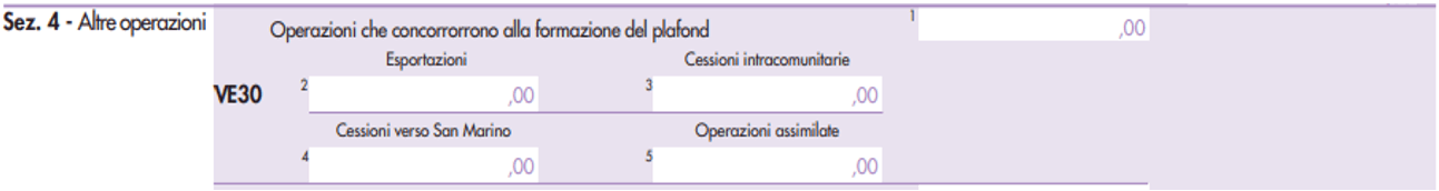 Il rigo VE30 è composto di 5 campi, di cui quattro sono dei “sotto-campi” che servono per splittare il valore complessivo del rigo nelle quattro categorie di operazioni che formano plafond: