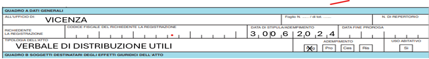 - Quadro A – indicare il nome dell’ufficio dell’agenzia delle Entrate, il codice fiscale della società, la data della delibera, in tipologia atto scrivere “delibera distribuzione utili” e barrare la casella Reg;
