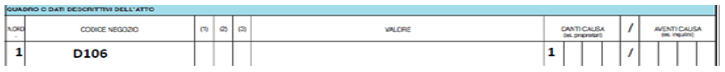 - Quadro C – indicare ord. 1, codice negozio D106, danti causa 1.