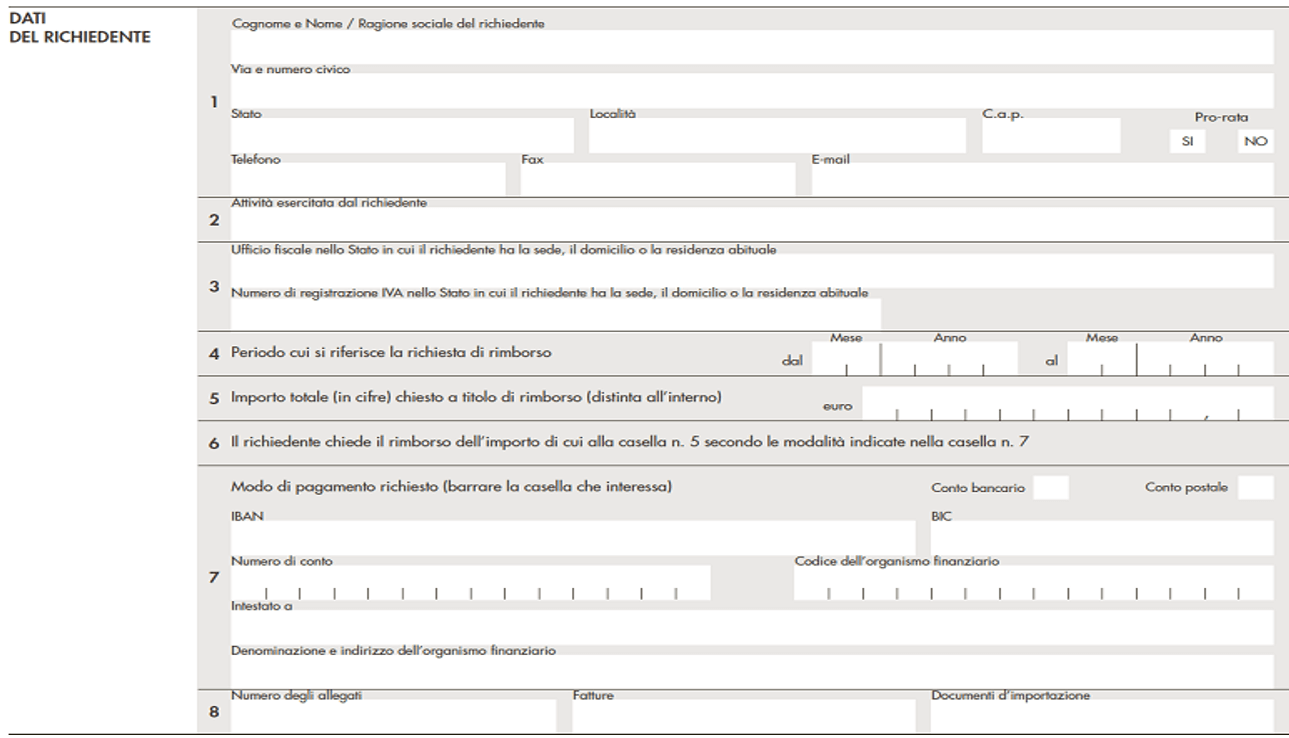 - ufficio fiscale e numero di registrazione Iva nello Stato in cui il richiedente ha la sede, il domicilio o la residenza abituale;