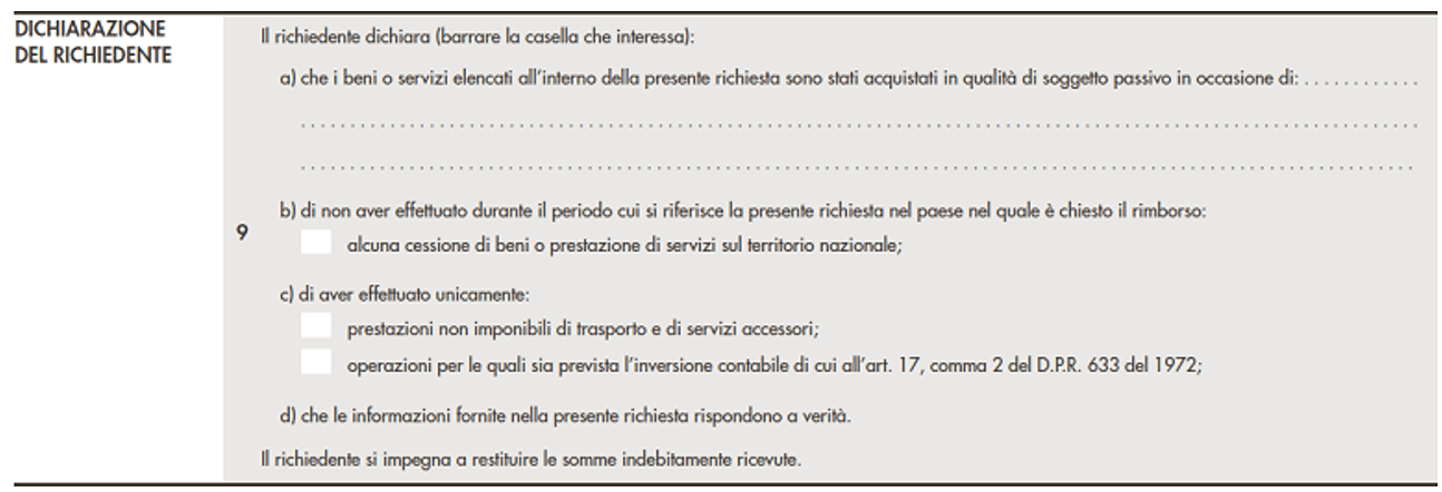 DICHIARAZIONE DEL RICHIEDENTE, ove riportare le dichiarazioni relative alla presenza delle condizioni per il rimborso (quale, ad esempio, quella di non aver effettuato, nel periodo di riferimento, operazioni imponibili in Italia, ovvero che le informazioni fornite nell’istanza di rimborso corrispondono a verità).