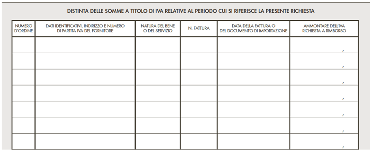 DISTINTA DELLE SOMME A TITOLO DI IVA RELATIVE AL PERIODO CUI SI RIFERISCE LA RICHIESTA, in cui riportare: