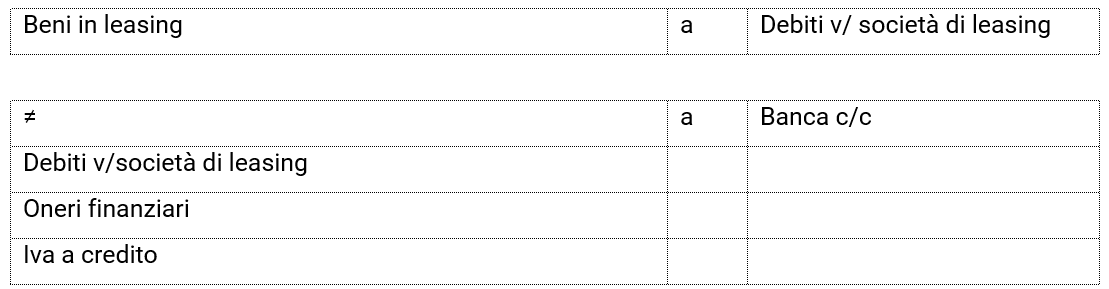 L’acquisto del bene da parte della società di leasing è contabilizzato secondo le regole ordinarie, di cui all’articolo 2424 cod. civ., secondo il quale i beni oggetto di locazione finanziaria sono iscritti tra le attività dello stato patrimoniale. La scrittura contabile risulta essere la seguente: