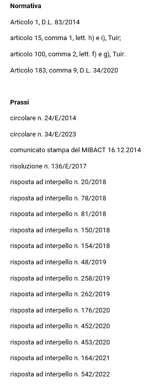 La menzionata disciplina del Tuir resta, comunque, in vigore per le fattispecie non contemplate dall’articolo 1, D.L. 83/2014, come, ad esempio, le erogazioni liberali per l’acquisto di beni culturali (circolare n. 24/E/2014).